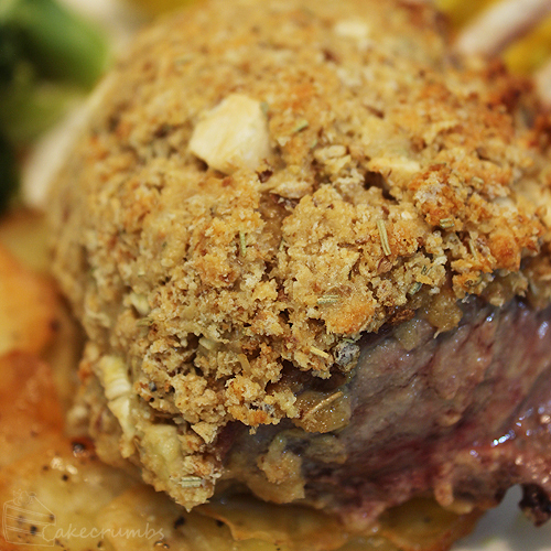 A delicious cut of meat begs delicious accompaniments. I served the lamb rack atop a potato galette and served it with broccoli and corn dolloped with garlic butter.