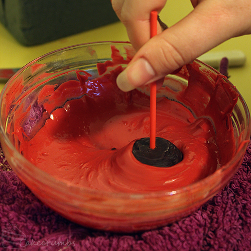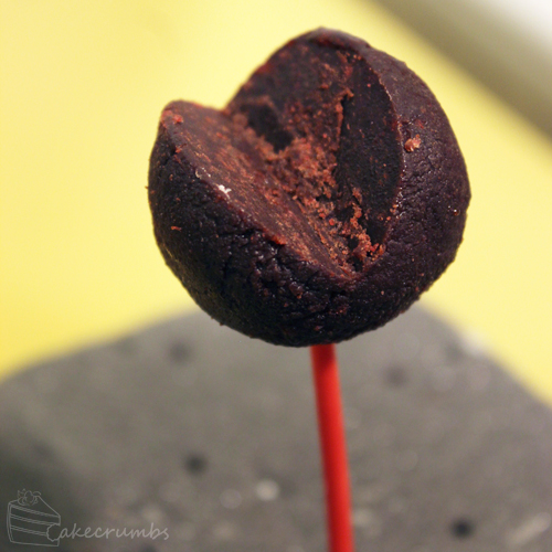 I really really dislike truffle recipes. Truffles are the kind of thing I tend to make up from leftovers. It’s all by eye and never by quantity. If I have a cake I need to carve, or if I have leftover cupcakes, or any excess cake at any time, I blend up the leftover cake into cake crumbs and freeze it until a day for making truffles arises. The type of cake you use will then influence how much icing you need to add. I prefer a resultant mixture that is set at room temperature: it’s nicer to eat and also means it won’t go sliding off the stick one it hits room temperature. There’s nothing worse than trying to roll truffles that are either two soft and need partial refrigeration to work, or are so hard they are impossible to roll. When I follow recipes, that’s what tends to happen. So there’s not a formal recipe for these guys, but I’m going to show you how I made them.