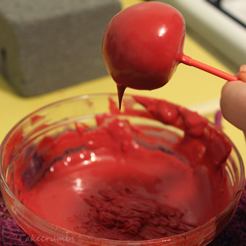 Dip the truffles into the chocolate so it’s completely covered right up to the stick. Leave no patch uncovered. Then hold the truffle by the stick over the bowl with one hand, then firmly tap that hand with your other hand to rid the truffle of excess chocolate. This is the gentlest way to do this I’ve found: tapping the stick against the side of the bowl can be too forceful and you sometimes end up dislodging the truffle from the stick.