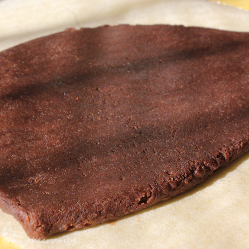 With the remaining mixture, roll it out between two sheets of baking paper until it’s about half a centimetre thick. This is for the thicker top of the pipe: you don’t need it to be excessivly thick as it will gain volume once dipped in chocolate.