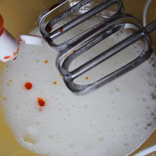 3. Beat the egg whites until foamy; add enough gel paste or powdered food colouring here to make the egg whites really vibrant. Continue beating on low speed, adding caster sugar a tablespoon at a time. Increase to high speed and beat until mixture forms stiff peaks and is glossy. You should be able to hold the mixture above your head without it falling.