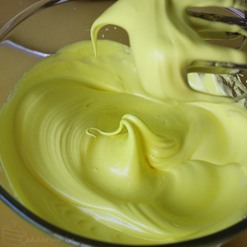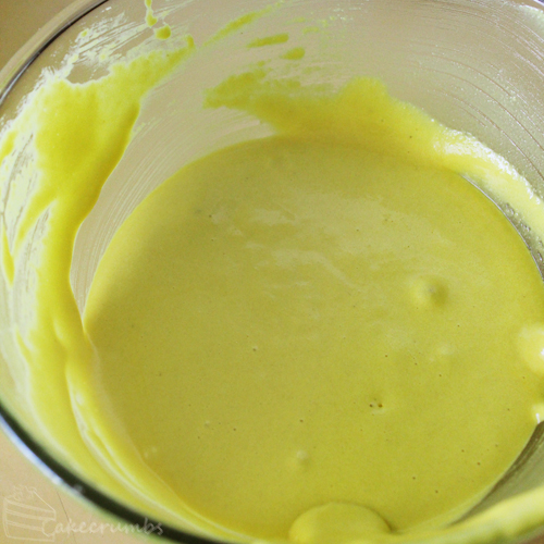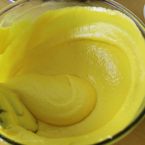 When colouring the batter, you want to start by beating the mixture until it is frothy, then add the colouring. Only use gel paste or powdered food colouring. And liquid colouring will make the batter too runny and cause problems down the track.