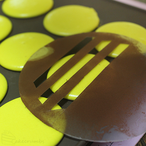 To make the stripes on the bees I created a little template of 1/4 inch stripes from a spare piece of acetate I had. I waited until the macarons had dried and formed a skin over the top, then sprinkled some dutch processed cocoa into it.