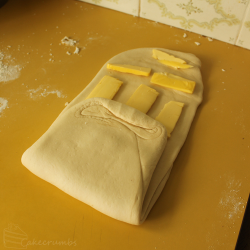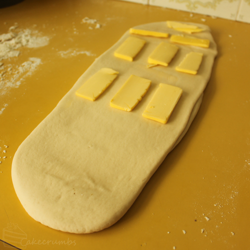3. Roll out the dough to a rectangle 50x15cm (20 x 6in). Divide the butter into three. Dot the top two thirds of the dough with one part of the butter, fold the dough in three and roll. Repeat using other two parts of butter. Rest between rollings. Repeat the folding and rolling three more times.
