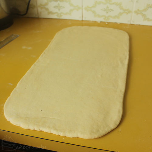 5. To shape the croissants, roll the dough out into a rectangle slightly larger than 45 x 30cm (18 x 12in), cover with oiled polythene bag or damp cloth and leave for 10 minutes.