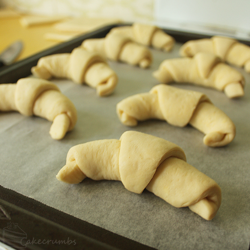 7. Beat the egg with water and sugar; brush over triangles. Roll up each triangle loosely towards the point, finishing with the tip underneath. Curve into a crescent.