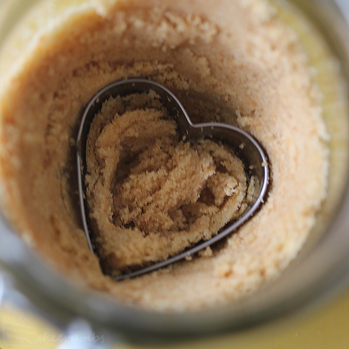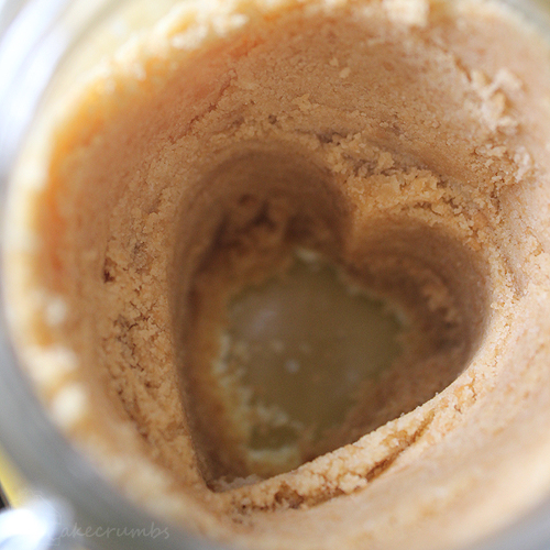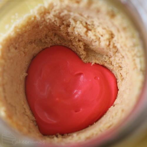I pushed the biscuit crumbs up the side of the jar so that from outside they would hide what was in the middle, then used a heart-shaped cutter as a guide for shaping the rest. I made the heart-shaped column deep and reaching as far as the bottom or the jar so you’re still getting a decent amount of filling with the biscuits.