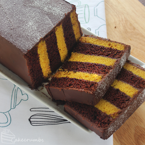 Assembly is as simple as spreading on a layer of chocolate ganache, piling an opposite coloured layer on top, giving that layer the ganache treatment and comtinuiong until you run out of layers. At this point it makes a nice bumblebee-looking cake.