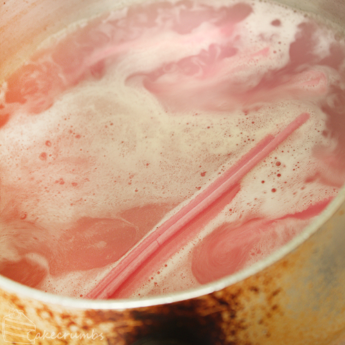 Making the glaze is another simple process. The Redskins are boiled in the milk and sugar while you take a stick blender to the mixture to break down the lollies. Once it’s brught to temperature, you add in the gelatine and mix it through.
