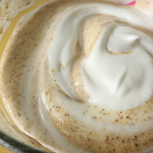 In the main mixture you’ll beat in egg yolks, then you’ll fold in some egg whites and bake.These sponges always take a matter of minutes to bake, so you want to hang around and keep a very close eye on them.