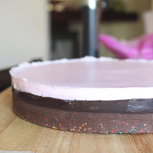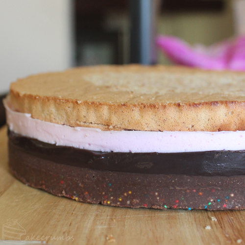 The only layer I assembled as I went was the jaffa ganache layer. I found it was still a little tacky after freezing and didn’t want to cover it with more plastic for that reason. So I attached that one to the freckles layer after it had frozen, then stored the two together. You could attach it as you go.