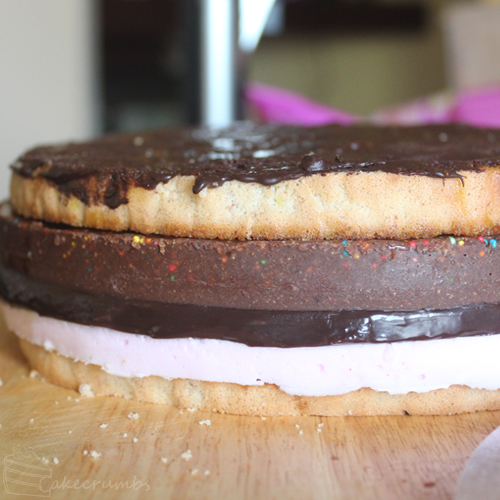 I ended up assembling my cake slightly differenty to the method. My ganache was set well enough, but it was sticky. Mine adhered to the plastic lining of my tin, so I attached it to the freckles layer first then set about removing the plastic. If this happens to you, you can dislodge the plastic lining it by warming the ganache at the surface. I did this by dipping a knife in hot water and running it over the plastic. This melted a fine layer of ganache between the plastic and the main layer and allowed me to peel back the plastic. This meant I couldn’t turn over the ganache layer without it adhering to another surface, so I kept building up.