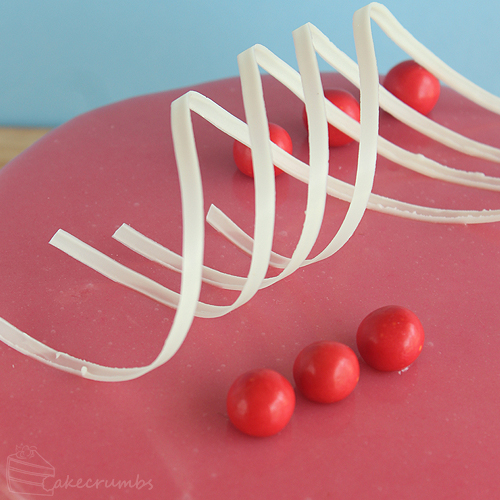 The original cake was decorated with red isomalt spirals. I was so indecisive about whether to include them or not. I wondered if they would look as fitting on a round cake as they did on the rectangle, or if the red was not contrasting enough against the hot pink. I spent so long being indecisive that eventually it was too late to organise the isomalt and the decision was made for me. I opted for white chocolate spirals instead.