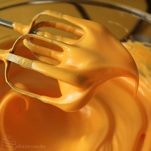 3. Beat the egg whites until foamy; add enough gel paste or powdered food colouring here to make the egg whites really vibrant. Continue beating on low speed, adding caster sugar a tablespoon at a time. Increase to high speed and beat until mixture forms stiff peaks and is glossy. You should be able to hold the mixture above your head without it falling.