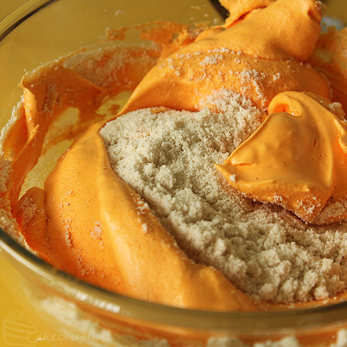 4. Fold the almond meal mixture into the meringue a third at a time.