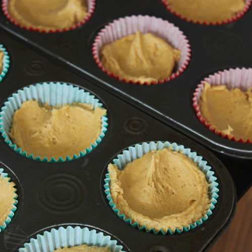 Last of all you’ll fold the pumpkin and flour in alternatively until your batter is all done. The batter tastes amazing and you might be tempted to eat it as is, so try to get some of it in the patty pans.