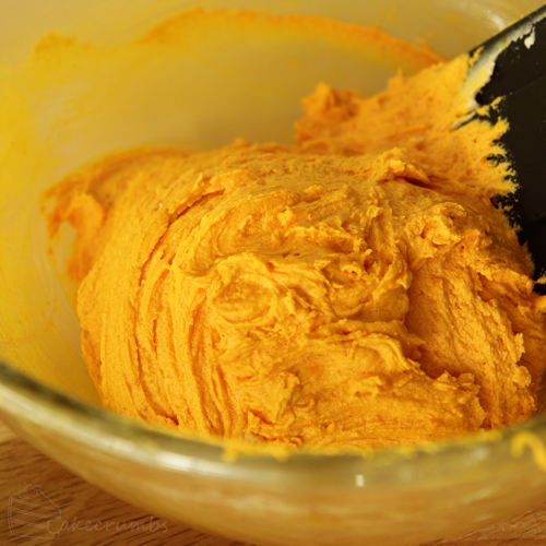 Divide the buttercream into two and place half in a separate bowl. Tint one half orange and the other black.