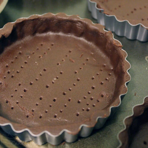 This recipe starts with a basic shortcrust. I added some cocoa in with the flour mixture, and substituted the butter for a soy spread. I’ve seen a few olive oil shortcrust pastry recipes around, so you could use that, too. You simply pulse the ingredients in a food processor until its all crumbled up, then add a little water and pulse until it all comes together.