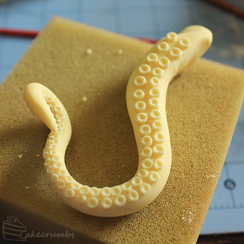 How to paint it was another point of indecision. Often when you paint with food colouring, you usually mix it with some kind of alcohol to make a ‘paint’. The thing with doing that is that you get an effect that’s much like painting on a canvas with acrylics: you get a raised effect with the paint. It gives texture. I didn’t want the skin of the octopus skin to have additional texture, so I oped to paint it with dry powdered food colouring instead. This turned what could have been done in an hour or two into a 10 hour paint job. Building up colour with powder is very slow going, but the result is worth it. Perhaps one day I’ll have to invest in an airbrush to make life easier, but for now it’s powder and patience.