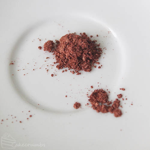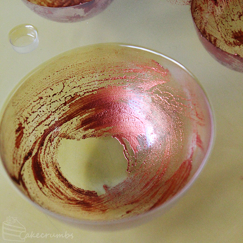 You can use most any lustre dust for this, it doesn’t have to be metallic. I’m going for bronze here because I love the colour so much. Gold is pretty, but it’s done so often. For the alcohol I’m using almond essence mainly because I never have any booze on hand. These little flavouring essences are alcohol. I use them for painting the food colouring all the time and they work great. It’s better than using water or a syrup as the alcohol will evaporate. If you have vodka or similar on hand, you can use that.