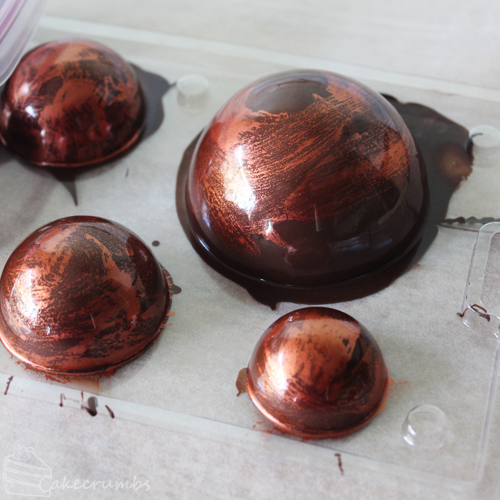 I was making a bunch of hemispheres to adorn the cake with and thought it would be a good opportunity to show you guys how to get a metallic effect when chocolate making. I’ve seen lots of stuff around that involves painting the chocolate with lustre dust after it’s set, buts it’s messy and falls off any time you touch it. You can also use gold leaf, or the imitation stuff, but this is cheaper, easier, and is set right into the chocolate.