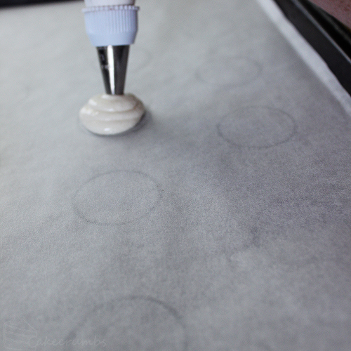 1. Prepare baking trays with double sheets of baking paper. Trace 3-4cm circles onto one of the sheets of baking paper as a guide for piping your macarons, leaving a few cm between each; make sure the side with the ink/lead is facing down so it does not come into contact with your food. Alternatively, use a silicone or macaron mat.