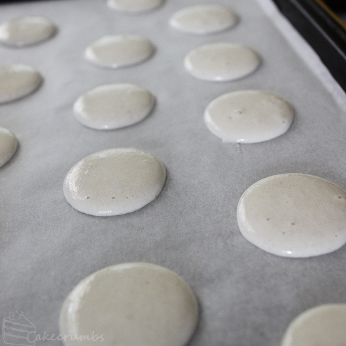 8. Place tray in the oven, reduce temperature to 140°C or 130°C fan-forced. Bake for 20-25 minutes. Here is where you need to experiment, as every oven is different and it will make a difference for macarons. Keep an eye on them and make sure your shells don’t char. Shells will be ready when they can be lifted from the baking paper without sticking. 25 minutes did it for me. temperature by about 10°C and baking for 10-15 minutes longer.