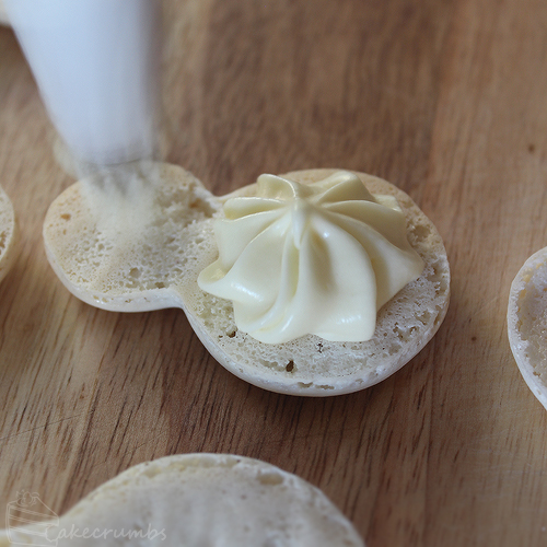 When your macs are baked and cooled, you can pipe the filling in. For the snowmen, pipe a dollop on the body and then another on the head. The filling will spread to cover the gap when you sandwich it.