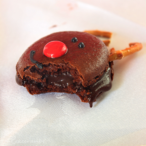 I made the rudolph macarons chocolate. I haven’t quite got the hang of chocolate macarons yet. Every time I try them end up coming out kind of cakey. This batch looked a bit more promising, until my oven turned itself off half way through baking them. So I don’t know if the textural difference is due to the cocoa or my oven spazzing it, so I’ll tentatively give you the option to follow what I did, but if you’d like to be more cautious just colour them brown.