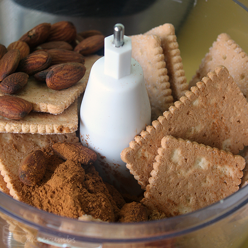 The biscuit base was originally going to be made with chocolate biscuits, but I can’t read and opened a packet of plain biscuits instead. To that I added almonds and some cinnamon as well: half because I like to pair orange with cinnamon and half because it is one of his favourite things ever.