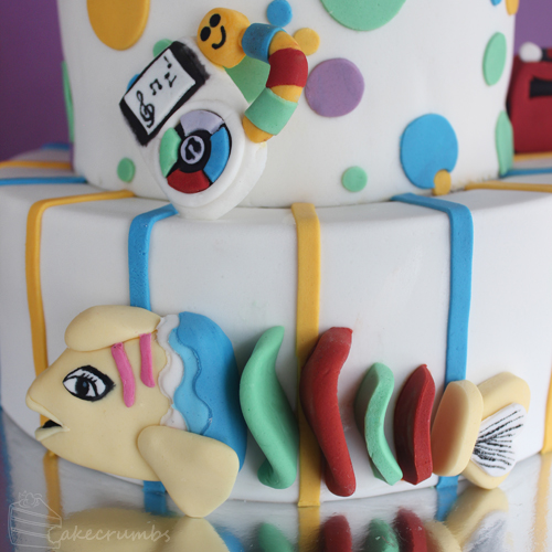 Then there was a wind-up fish toy, which presented some difficulties as the toy was made up of many segments that didn’t touch. I made it curve around the cake so it’d have something to attach to and would also remove the need for wiring. Kids have a habit of running up to the cake and shoving the fondant figures in their mouth, so keeping out inedible components is always preferable. Around this side of the cake was also a toy phone.