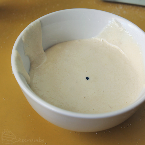 I wanted to make the eggs speckled. There are a number of ways you can do this, using food dye being the easiest, but I opted for cocoa splatters instead. For this, you’ll want to mix the cocoa with alcohol as the alcohol will evaporate much faster than other liquids. Any flavouring essence will do, preferably a clear one but it doesn’t matter too much for this.