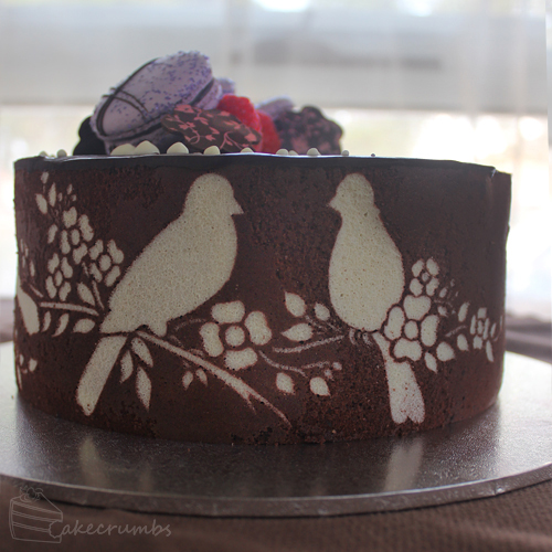 So far I’ve mostly used decorating combs for making patterns in the joconde paste. I’ve been wanting to use the sponge as more of a canvas for unusual designs. You always see them with uniform designs on the sides, but I wanted something a bit more picturesque. I had a number of food stencils, but all were a bit bland for what I was thinking. I hit up my favourite cake decorating store and started rummaging through the stencils until I finally found something that was more ‘me’.