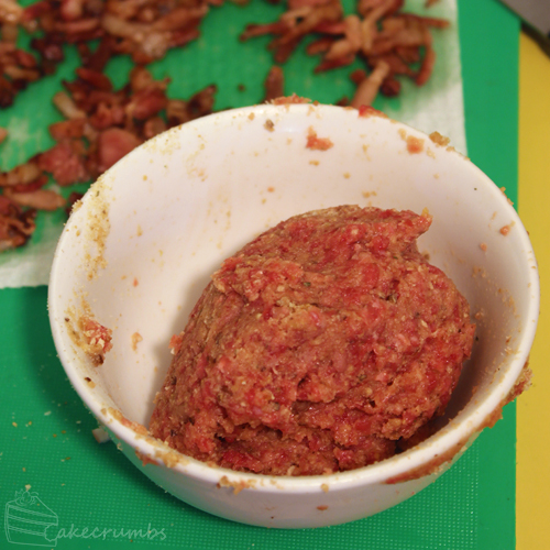 I wanted to make them meaty, but not like a meatloaf cupcake. I still wanted them to look like cupcakes. So I modified an old recipe. I fried off a handful of bacon first, then drained them on a paper towel. Next I took another handful of minced beef, mixed in an egg and enough breadcrumbs until it bound together. I didn’t bother measuring anything here, and you don’t have to.