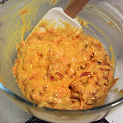Next for the cupcake mixture itself. You don’t have to be very fussy with anything here. Just dump all the cupcake ingredients into a bowl and whisk them to form a batter. Then I stirred in all the bacon bits.