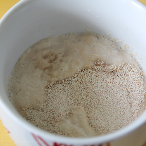 If you’re using dried yeast, like I did, it’s always best to proof it first. You want to make sure it’s still alive so you don’t go wasting all those ingredients. Give the yeast a bath of warm liquid, a little sugar for food and leave it covered for 15 minutes. If it starts to go frothy (and it gives off a lovely bread-y aroma) you’re good to go.