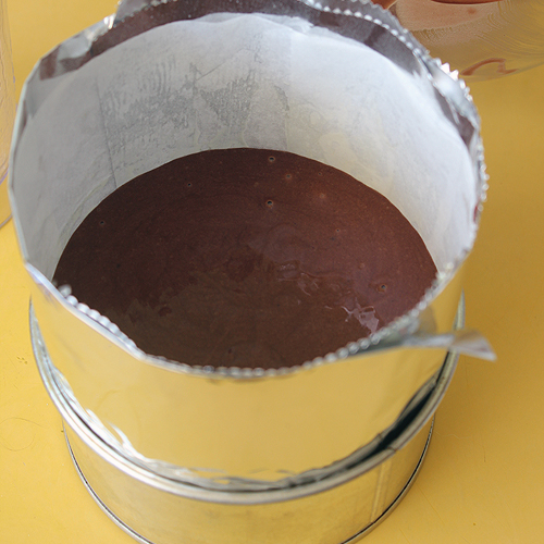 4. Pour the cake batter into the tin; bang the tin on the counter top a few times to release any air bubbles.