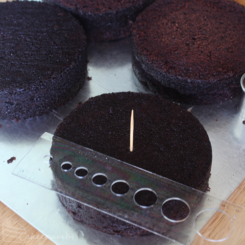 Now it’s time to carve your exterior cake. An important thing to do every time you set about carving is to find the middle of your cake. This will keep your internal design nice and symmetrical. I’m using a set of circular cutters to make the job easier, but you could always cut out some circular templates if you don’t have the cutter set.