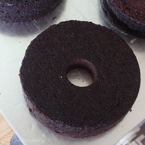 After finding the centre again I use the smaller cutter to take out the centre of the cake, then I use the larger one to mark where the base of that layer will be.