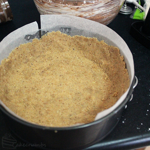 After preparing your pan you’ll wanna start with processing your biscuit crumbs, then adding enough butter to make them adhere. I’ll give you measurements in the recipe, but I didn’t measure. I was using leftovers so I had an unspecified weight to work with, but sometimes it’s better to not measure for this bit. It’s best to add the butter gradually and stop once you can press the crumbs together.