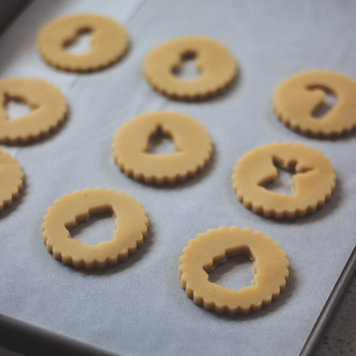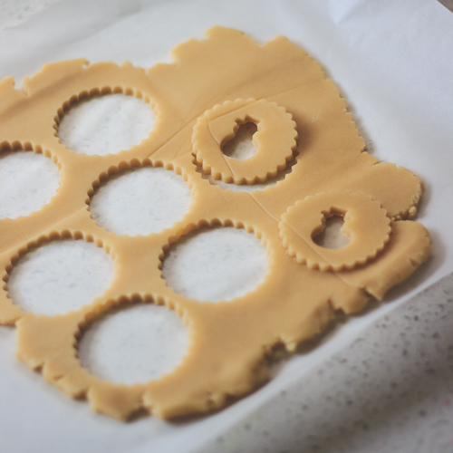 - Roll dough out between two sheets of baking paper to roughly 5mm thick. Use cookie cutters to cut rounds of cookie dough and to cut shaped from the centre. Place on baking tray; bake for 10 minutes.