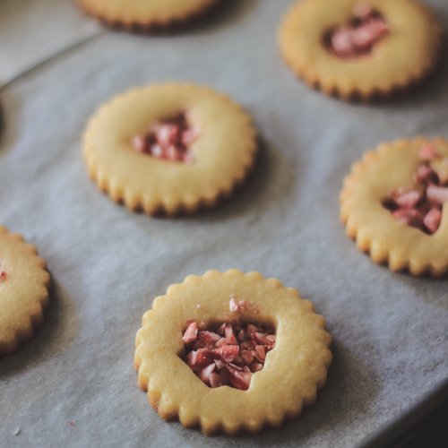 - Remove from the oven; pour crushed candy canes into the centre of the baked cookies. Return to the oven for 5 minutes, or until the candy canes have just started to melt.