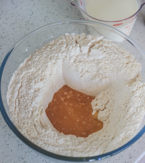 I started the dough off in the usual way, making a well in the centre before adding the melted butter and then most of the milk. Like any dough, how much moisture it needs can vary by region or by weather, so I always err on the side of caution and add the rest of the milk if and when needed.