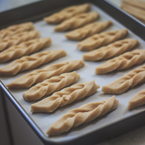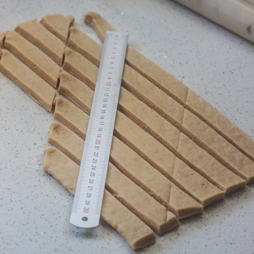 Once the dough has chilled the fun begins! You can eyeball this if you want to but using a ruler to guide you certainly makes life easier. The dough is cut into long strips and then cut again on the diagonal.