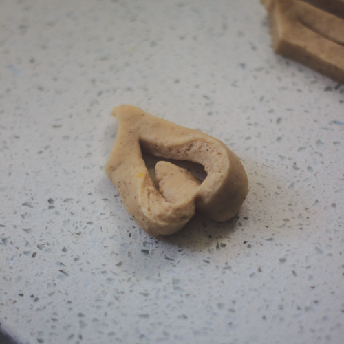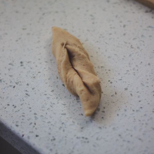 Those individual piece of dough are slit down the middle before being twisted into a knot.