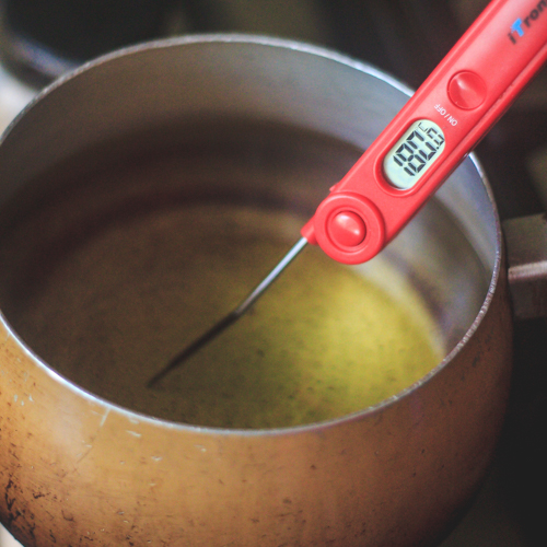 After a good halfa to chill its time to get the oil ready. If you have a deep fryer this is probably easier, but I don’t. The dough needs to be fried at 180°C: too hot and the dough will cook only on the outside, too cold and the dough will soak up too much oil before it cooks.
