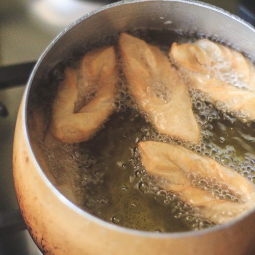 - Heat oil to 180°C. Fry biscuits in batches until golden brown and cooked through. Drain on paper towel, the transfer to a rack to cool. While still warm, dust with icing sugar.