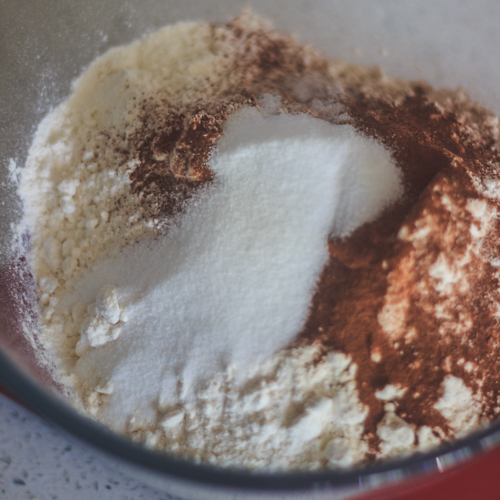- In a large bowl, add the flour, cinnamon, sugar and chilled butter. Rub the butter into the mixture with your fingertips until the mixture resembles fine breadcrumbs. Alternatively, use a food processor to pulse the mixture.