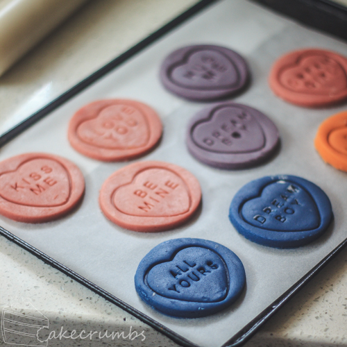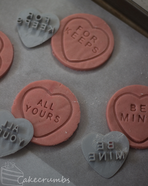 - Emboss the dough with the lettering, then the heart shape, then cut out with a 6cm round cutter. Place on the baking tray. Chill in the fridge again for 30 minutes before baking to minimise spreading