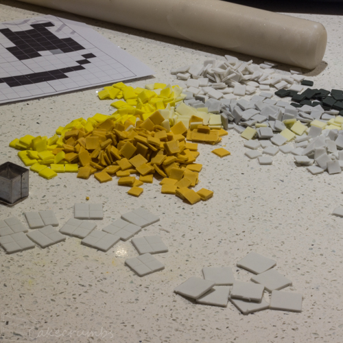 Usually this is where I’d cover the cake but I decided to do it a bit different. I cut teeny little squares of fondant in all the colours I needed. To get the pattern I used a program I normally use for cross stitch patterns but the same principle applied here. I simply measured the cake as a canvas, chose the resolution and let it do the work.